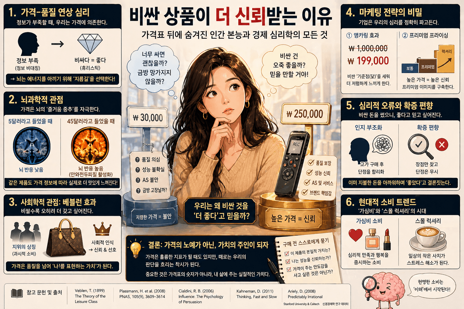 비싼 상품이 더 신뢰받는 이유: 가격표 뒤에 숨겨진 인간 본능과 경제 심리학의 모든 것 우리는 매일 선택의 기로에 섭니다. 마트의 진열대 앞에서, 혹은 온라인 쇼핑몰의 상세 페이지를 넘기며 수없이 많은 가격표를 마주하죠. 그런데 참 묘한 일이 있습니다. 분명 지갑 사정을 생각하면 저렴한 물건에 손이 가야 정상인데, 이상하게도 너무 싼 물건을 보면 '혹시 어디 고장 난 건 아닐까?', '금방 망가지는 거 아냐?'라는 의구심이 먼저 듭니다. 반대로 헉 소리 나게 비싼 물건 앞에서는 '오죽 좋으면 이 가격일까' 하는 묘한 신뢰가 생기곤 하죠.저도 예전에 비슷한 경험이 있습니다. 중요한 발표를 앞두고 녹음기를 하나 사려는데, 3만 원짜리와 25만 원짜리 사이에서 고민했죠. 스펙상으로는 큰 차이가 없었음에도 불구..
