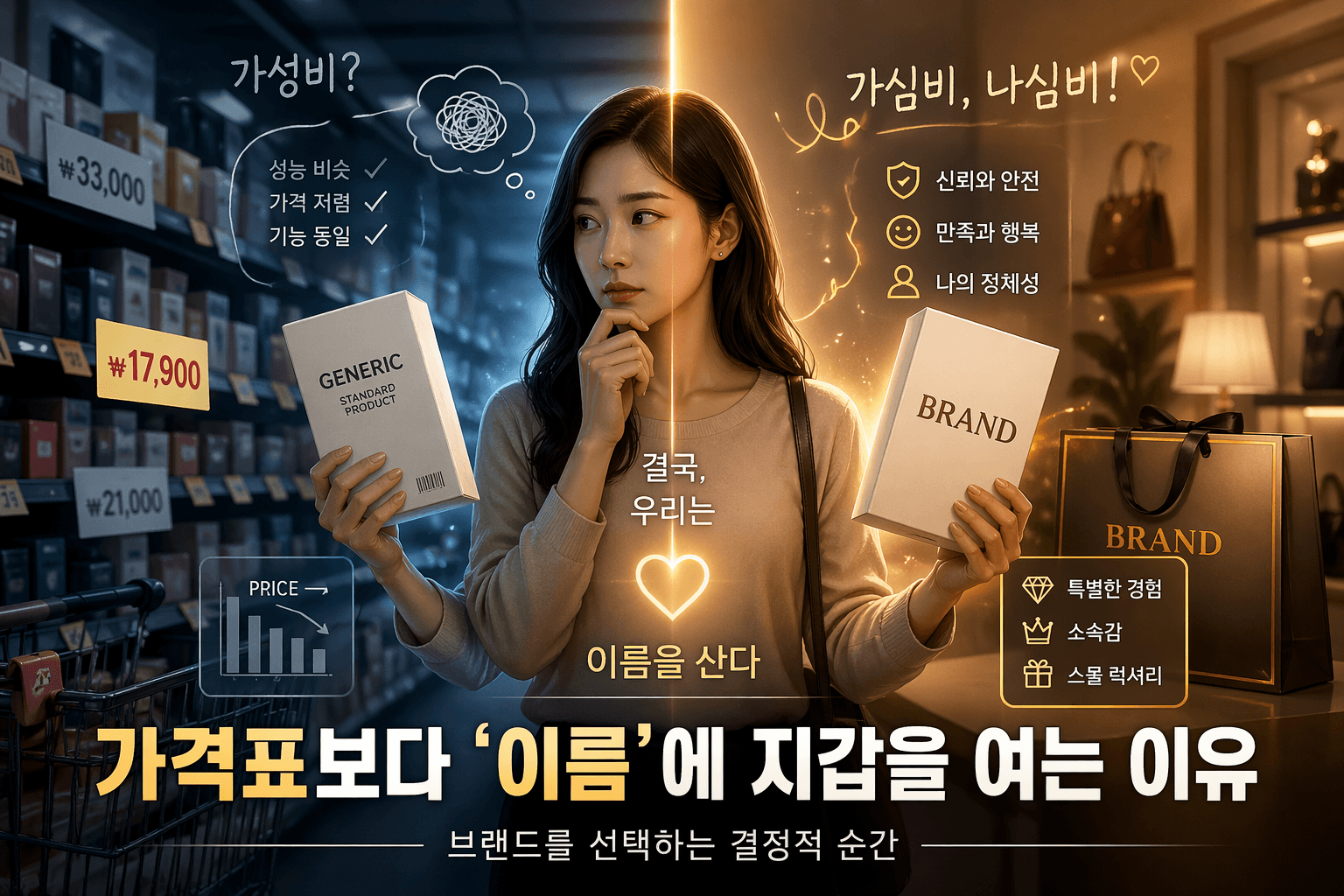 가격표보다 '이름'에 지갑을 여는 이유: 브랜드를 선택하는 결정적 순간우리는 매일 선택의 기로에 놓입니다. 마트에서 우유 하나를 고를 때부터, 큰맘 먹고 구매하는 전자기기까지 말이죠. 그런데 이상한 점이 있습니다. 성능이 거의 비슷하고 가격은 훨씬 저렴한 가성비 제품이 눈앞에 있는데도, 우리는 결국 몇 배나 비싼 특정 로고가 박힌 제품을 집어 들곤 합니다. 왜 그럴까요? 단순히 허세일까요, 아니면 그 이상의 가치가 숨어있는 걸까요?1. 가성비의 시대가 가고 '가심비'와 '나심비'의 시대가 왔다최근 몇 년간 소비 시장을 지배했던 단어는 '가성비'였습니다. 하지만 2024년과 2025년을 지나며 시장의 흐름은 급격히 변했습니다. 이제 소비자들은 단순히 가격 대비 성능만을 따지지 않습니다. 나의 심리적 만족을..